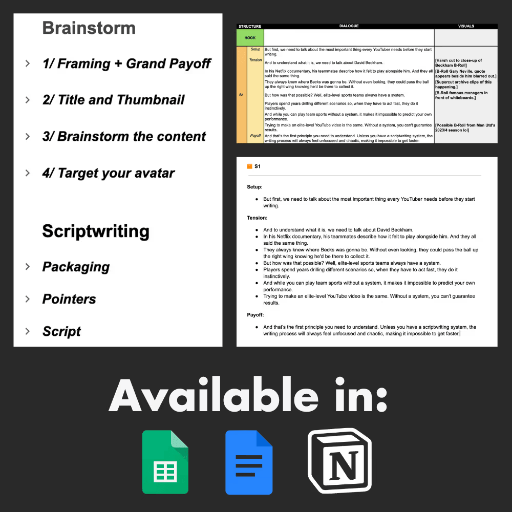 Sử dụng các mẫu kịch bản ưa thích của tôi và công cụ phân tích đối tượng khán giả, được thiết lập để linh hoạt theo phong cách riêng của bạn. Theo dõi tiến trình viết kịch bản bằng công cụ YTSP Script Engine. Sử dụng mẫu viết kịch bản của tôi để tối ưu hóa quy trình viết (hiện có sẵn trên Notion, Docs và Excel). Vẽ ra hồ sơ đối tượng khán giả với một mẫu cực kỳ tiện dụng để giúp bạn tạo ra nội dung hấp dẫn hơn, nhanh chóng hơn.