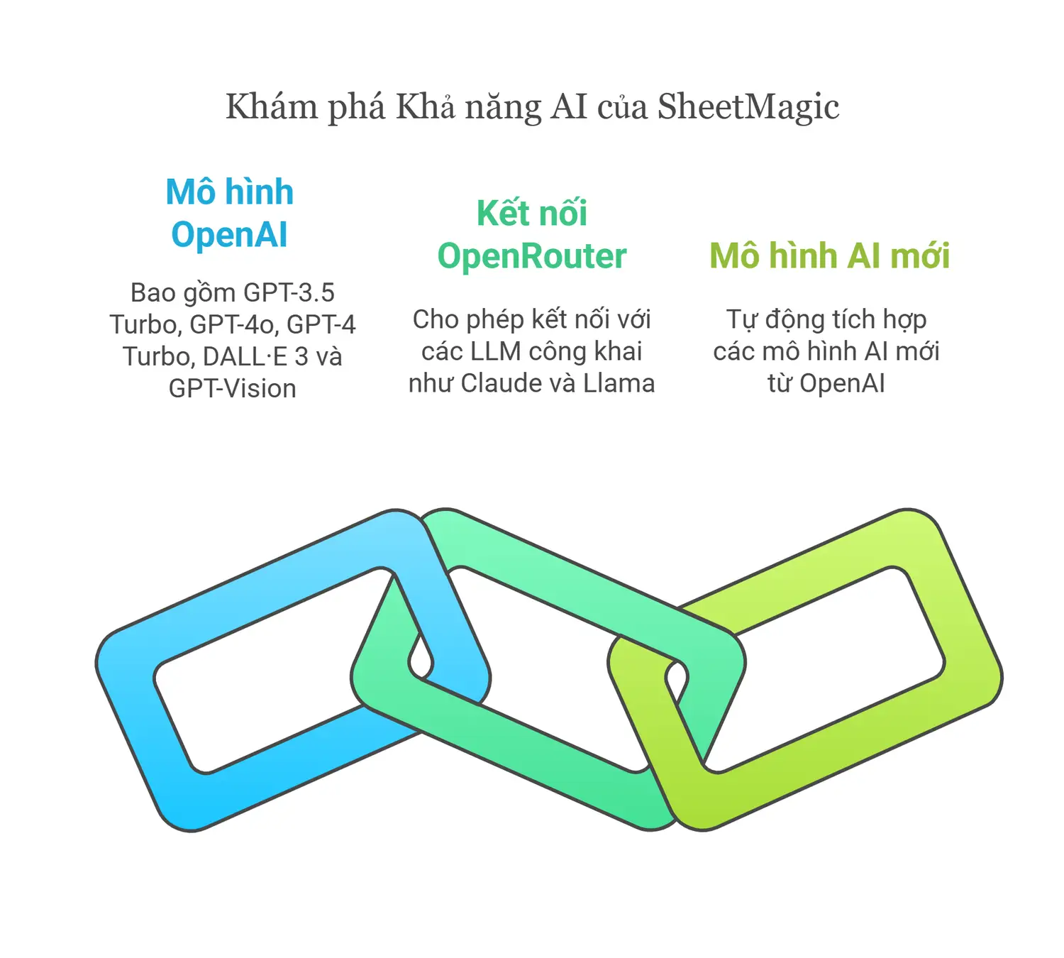 Bạn có thể sử dụng GPT-3.5 Turbo, GPT-4o, GPT-4 Turbo, DALL·E 3 và GPT-Vision. SheetMagic cũng sẽ bao gồm tất cả các mô hình AI mới khi OpenAI phát hành trong gói của bạn.